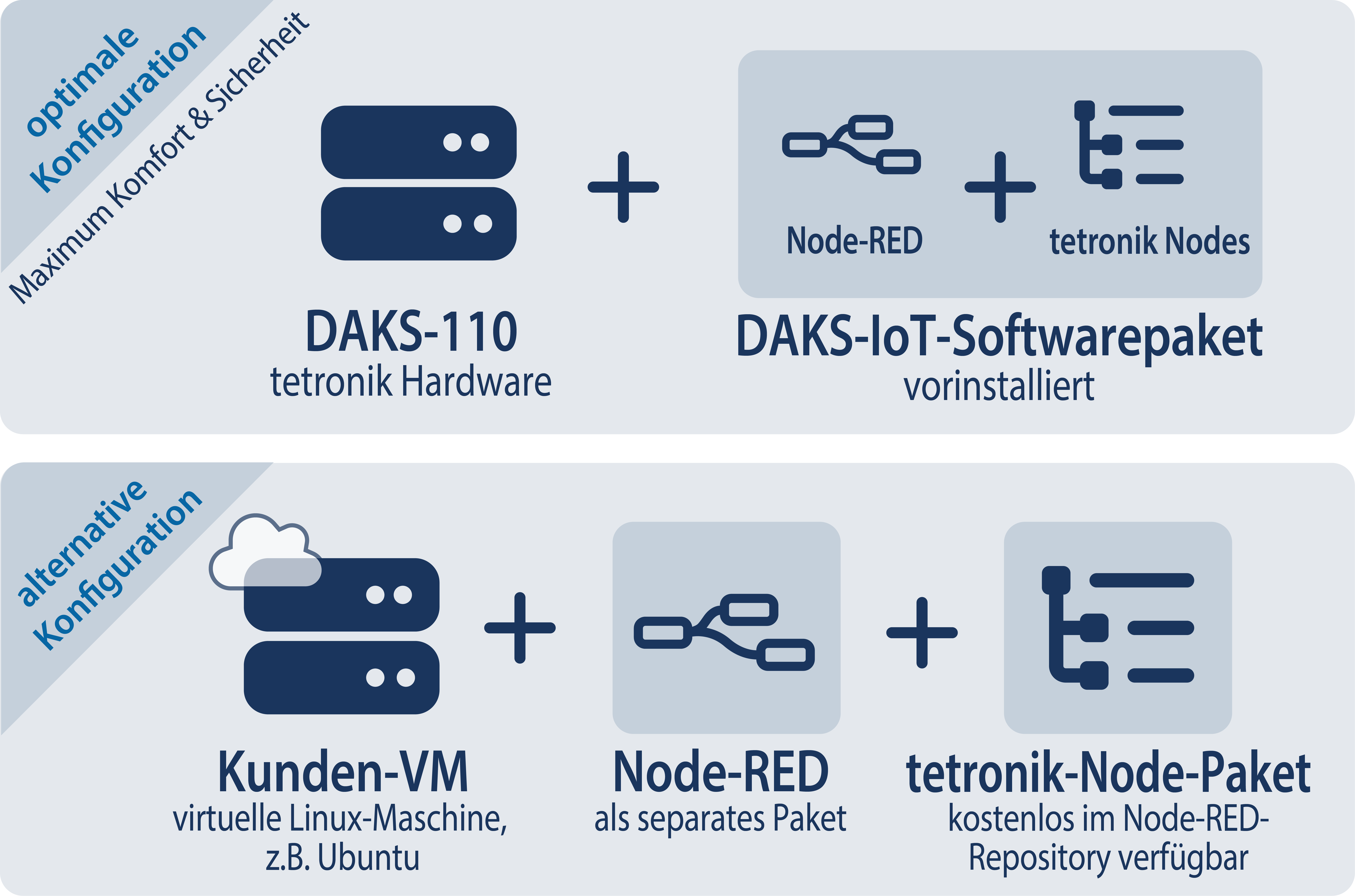 Das tetronik-Node-Paket ist OpenSource und kostenlos im Node-RED Repository (node-red-contrib-tetronik-daks-iot) verfügbar. Bei bereits vorhandener Node-RED Kundeninstanz kann das Paket direkt mit DAKS verwendet werden (Voraussetzung dafür ist eine freie ESPA-X Lizenz am DAKS-Server). Hardware-spezifische Nodes sind nur mit dem vorbereiteten DAKS-IoT-Image verfügbar.