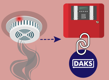 As smoke forms in a room, the installed smoke detector sends a signal to the fire alarm control panel. The DAKS alarm server is connected to the control panel and takes over numerous communication tasks.